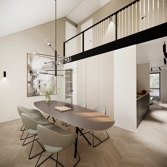 De woonverdieping beschikt over een royale zitkamer met toegang tot een ruim balkon op het zuiden. Hier geniet u de hele dag van zon en uitzicht. De eetkamer ligt onder een vide, wat zorgt voor extra lichtinval en een bijzonder ruimtelijk gevoel. Ideaal voor lange diners, gezellige avonden of een stijlvolle werkplek.
