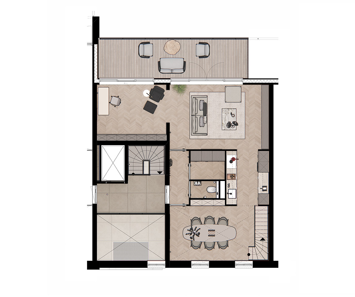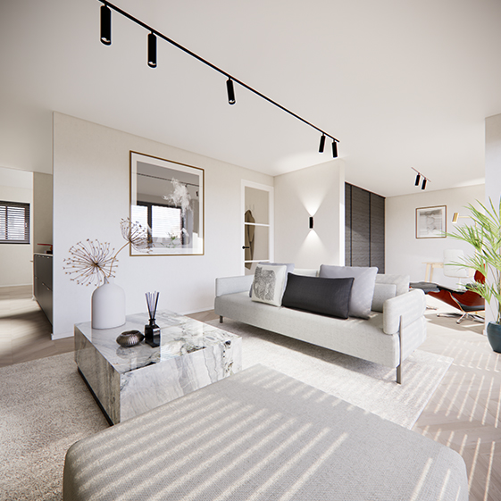 Met een woonoppervlakte van ca. 127 m², verdeeld over twee verdiepingen, biedt appartement 4 een bijzondere combinatie van licht, hoogte en luxe. Deze maisonette valt op door eigentijdse architectuur, verrassende zichtlijnen en royale buitenruimtes.
