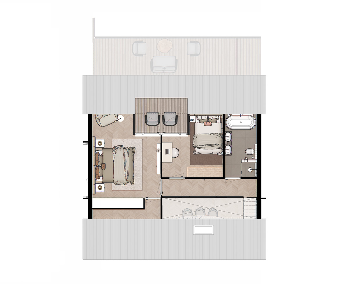 Op de bovenverdieping bevinden zich twee ruime slaapkamers, beide met toegang tot een beschutte loggia. Een fijne buitenruimte om rustig de dag te beginnen of ’s avonds te ontspannen.