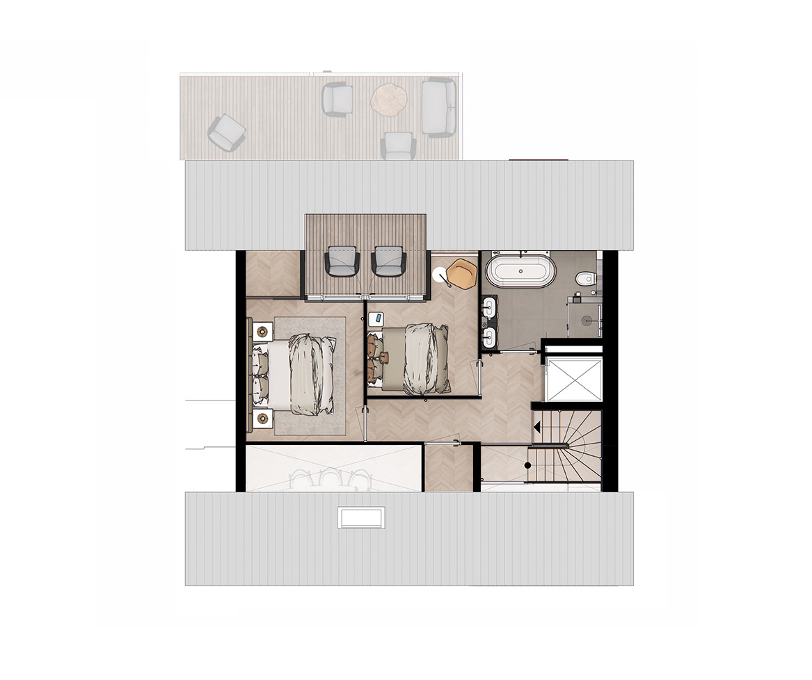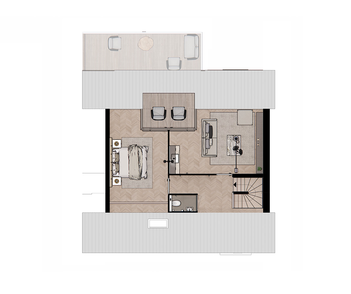 Op de tweede verdieping treft u een royale hoofdslaapkamer en een extra zit- of werkkamer die via openslaande deuren toegang geeft tot een groot dakterras. Dit terras vormt een echte eyecatcher: een beschutte buitenruimte waar u de hele dag door van zon en uitzicht kunt genieten. Een tweede badkamer met toilet maakt deze verdieping compleet en verhoogt het wooncomfort.