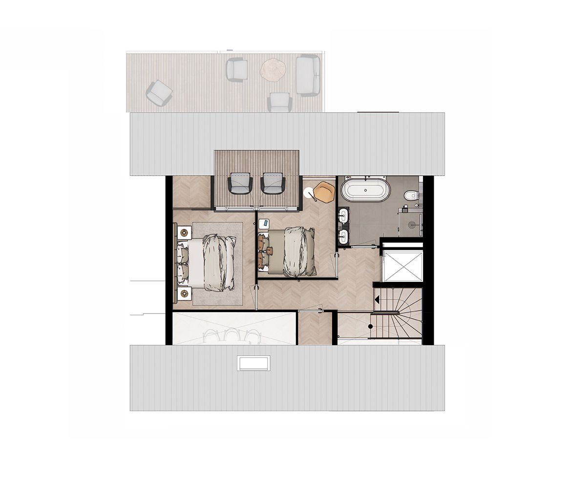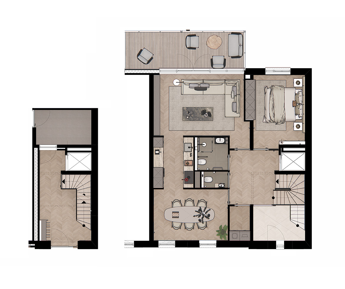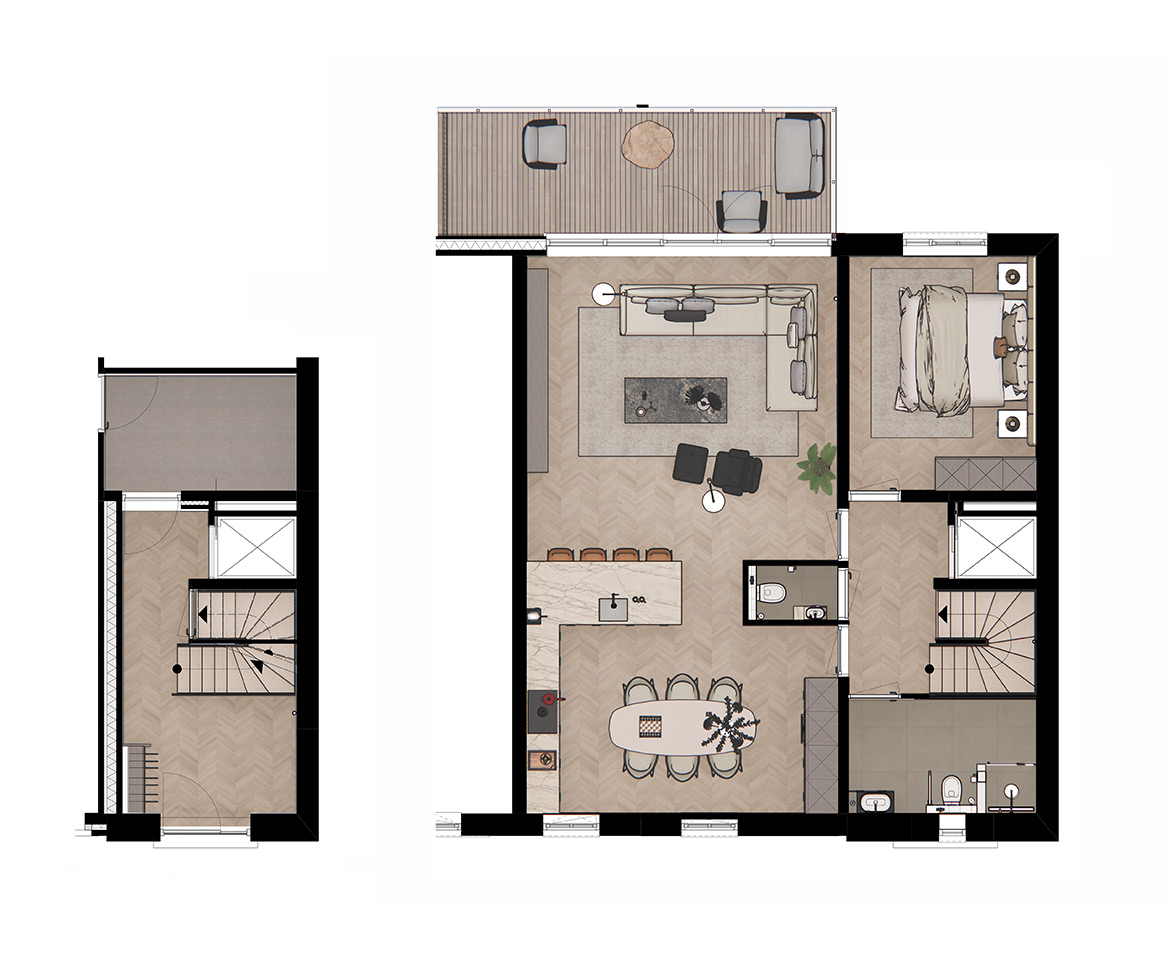 Dit royale appartement is voorbereid op zorg aan huis. De eerste verdieping biedt alle faciliteiten die een rolstoeler nodig heeft, terwijl de tweede verdieping ruimte biedt voor een mantelzorger of inwonend familielid. De architect heeft hier nadrukkelijk op geanticipeerd, waardoor dit appartement uniek is in zijn soort. Een eigen lift kan tegen een meerprijs van €30.000 gerealiseerd worden.